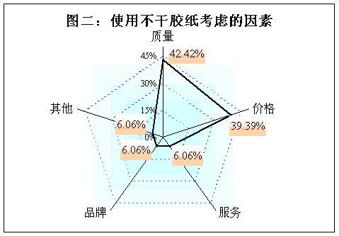 從圖二中的數據可以看出,國內有42%以上的不干膠紙使用企業認為產品質量是首要的考慮因素,另有近40%的企業認為產品價格是他們選擇不干膠紙產品時考慮的首要因素。以上數據表明,中國企業在選擇不干膠紙時都比較務實,更加關注產品本身的質量和價格,而關注產品品牌和服務的企業則非常少。