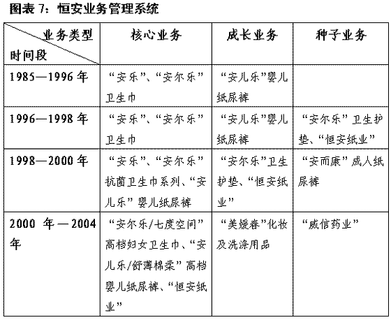 非常能說明恒安集團(tuán)競(jìng)爭(zhēng)戰(zhàn)略“穩(wěn)”之道的是其為締造“中國(guó)頂級(jí)家庭生活用品制造商”所精心安排的相關(guān)多元化產(chǎn)業(yè)發(fā)展戰(zhàn)略業(yè)務(wù)管理系統(tǒng)上,它奠定了“百年恒安”可持續(xù)發(fā)展的制度化基礎(chǔ)。(見圖表7)