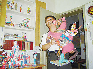在南昌下水巷10號(hào),63歲的老人徐傳托擁有用廢紙做原料來捏工藝品且捏得栩栩如生的絕活。昨日上午,記者在老人家的客廳內(nèi)看到了上百件栩栩如生的工藝品,精國英雄岳飛騎馬、雜技表演、理發(fā)匠、打鐵匠……