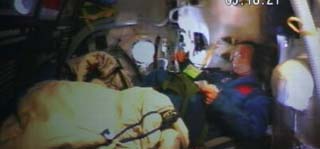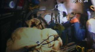 神六航天員在太空不能刷牙和沐浴,他們吃一種似口香糖的清潔劑代替刷牙,用專用紙巾來清潔身體。 13日9時17分,神舟六號航天員費俊龍用紙巾擦臉,做清潔工作。圖為神舟六號航天員費俊龍用紙巾擦臉。