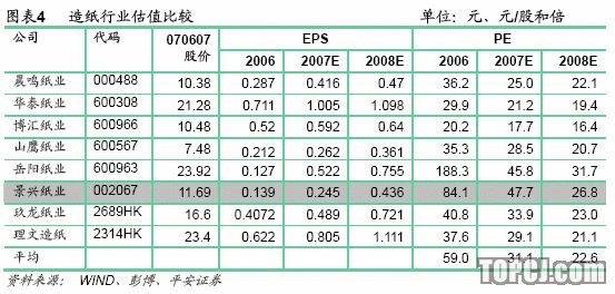 按照攤薄后的每股收益以及2007年6月7日11.69元的收盤價格來計算,公司07-09年的動態PE分別為:47.7、26.8和23.2倍,在目前造紙行業中并不具有明顯的吸引力。我們認為市場可以接受24倍左右的PE估值,那么未來兩年對應的合理價格區間為10.9-12.57元,未來兩年合理的價格中值為11.73元,所以我們認為目前公司11.69元的價格比較合理。