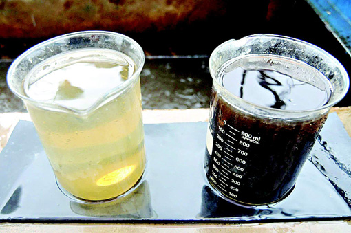 兩個燒杯從不同的地方裝滿水,并排放在地面,右邊一杯烏黑渾濁,左邊一杯淺清無雜質。對一家主營紙漿生產的企業來說,產生的污水在排放前能發生如此截然不同的變化,實現達標排放,是企業注重環保,狠抓污水治理工作的結果。