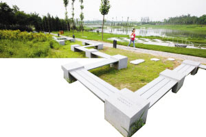 此時此刻,不知你是否注意到一條蜿蜒別致的綠色長椅。天然魯灰石上鋪著挺括的板材,30余節造型簡潔的長椅,布局筆斷意連,蜿蜒五六十米,宛如游龍,靜靜地守候在湖邊、林地。