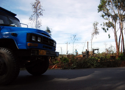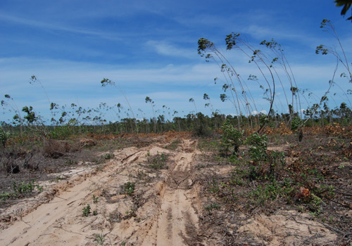 前面是一條盜伐者的車在林地里碾出來的路。他們瘋狂盜伐林木,然后把木材裝上車,運往加工廠賣錢。