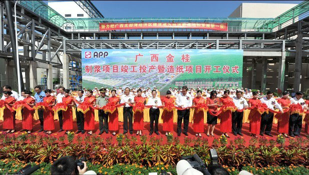 2010年9月8日,位于北部灣國家級經濟開發區的廣西欽州市大欖坪金光工業園,彩旗飄舞、鑼鼓喧天,由亞洲漿紙業有限公司(Asia Pulp & Paper Co., Ltd.,簡稱APP)投資79億元建設的廣西金桂林漿紙一體化項目一期工程30萬噸化機漿項目順利投產,60萬噸造紙項目盛大開工。作為自治區重大工程,這標志著廣西大型林漿紙一體化項目建設取得重大成績,并將進一步促進廣西建立起新型的綠色循環經濟體系。