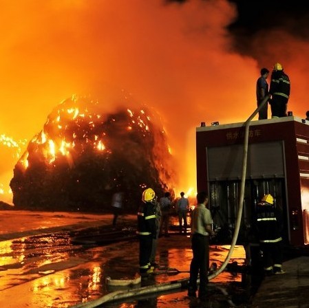 現場看到,正在燃燒的堆垛足有4層樓高,看起來就像一座座小山丘。大火正旺,噴涌的火焰直沖天際。火災造成的濃煙將整個廠區團團覆蓋。炙熱的高溫讓試圖救火的公司職工靠近不得,束手無策。不斷有飛火借助風勢四處飄散,引燃其他堆垛。整個原料區變成了一片火海,廠區安全面臨嚴重威脅。