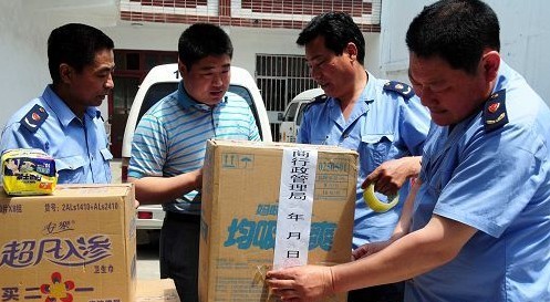 5月24日,山東省郯城縣工商執法人員對查獲的“高仿衛生巾”進行封存。