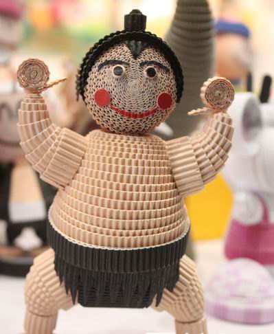 這些制作紙公仔的材料全部來(lái)自廢棄的紙箱和紙盒,通過(guò)加工、上色從而形成這種波紋紙。埔里造紙股份有限公司張健福介紹,這種環(huán)保紙公仔在臺(tái)灣很流行,深受年輕人的喜愛(ài),簡(jiǎn)單的制作流程、綠色環(huán)保材料加上獨(dú)特新穎的造型在動(dòng)手動(dòng)腦的同時(shí)亦陶冶了情操。