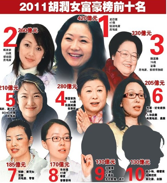 龍湖地產的吳亞軍以家族財富420億元,取代玖龍紙業的張茵,榮膺「2011年中國女首富」。與去年相比,吳亞軍家族財富增長50%,排名上升1位。碧桂園的楊惠妍以家族財富360億元再次躋身前三名,位居第二。與去年相比,楊惠妍家族財富增長50%,排名上升2位。陳麗華今年以財富330億元排名第三,排名與去年保持不變,但財富增長了22%。陳麗華的財富增長主要是因為北京房地產市場的上升。