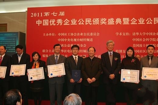 “第七屆中國(guó)企業(yè)公民年會(huì)”由中國(guó)社工協(xié)會(huì)企業(yè)公民委員會(huì)與中央電視臺(tái)、騰訊公益慈善基金會(huì)聯(lián)合主辦。今年的主題為:質(zhì)量與責(zé)任,創(chuàng)新與發(fā)展。本著公平、公正的原則,本屆年會(huì)評(píng)出“2011中國(guó)優(yōu)秀企業(yè)公民”、“2011中國(guó)成長(zhǎng)型企業(yè)公民”、“2011中國(guó)最具社會(huì)責(zé)任企業(yè)家”、“2011中國(guó)企業(yè)公民特殊貢獻(xiàn)獎(jiǎng)”、“2011中國(guó)企業(yè)公民優(yōu)秀公益項(xiàng)目”、“2011中國(guó)企業(yè)公民優(yōu)秀志愿者”、“中國(guó)企業(yè)公民領(lǐng)袖人物”七大獎(jiǎng)項(xiàng)。在當(dāng)天的頒獎(jiǎng)典禮上,金東總經(jīng)理馬志明上臺(tái)領(lǐng)取了“中國(guó)優(yōu)秀企業(yè)公民”獲獎(jiǎng)證書(shū)。