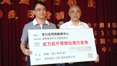 5月18日,全國第22個助殘日來臨前夕,在鎮(zhèn)江市京口特殊教育中心隆重舉行了“全國助殘日紀(jì)念活動”。活動現(xiàn)場,金東紙業(yè)向特教中心的殘疾兒童捐贈了“愛心修車房”。