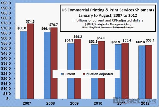 在本年度初,美國曾預測2012年美國商業印刷全年出貨量為805億~810億。從現在的數據來看,目前2012前八月的總出貨量只有528億美元,據新的預測,估計今年美國商業印刷總共出貨量將只有795億美元。