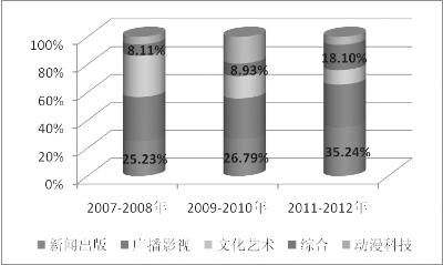 第三,國家文化出口重點項目凸顯多行業(yè)融合趨勢。國家文化出口型項目的支持區(qū)域覆蓋更廣,2011年至2012年,安徽等6個地區(qū)實現(xiàn)從無到有的突破,與企業(yè)變化基本保持一致。綜合類國家文化出口重點項目比例增加較為明顯,2007年至2012年平均增長率2.3%。更多的地區(qū)通過促進產(chǎn)業(yè)融合來開拓海外市場,取得良好的效果。