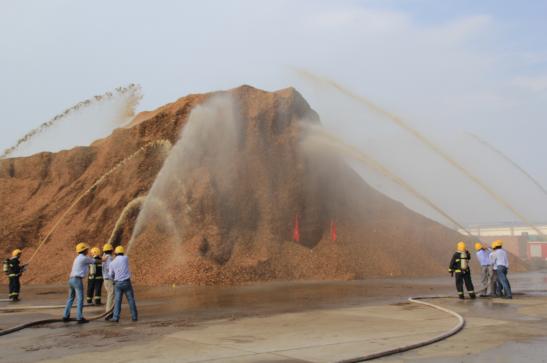 演練假設廠區木片堆場區域因工人違章燒焊,掉落的焊渣引燃木片,造成新堆儲干燥木片起火燃燒,現場巡視人員發現險情后第一時間撥打廠內報警電話,并聯系組織現場當班人員進行滅火。整個演習共出動消防車2輛,挖掘機1輛,消防及現場管理人員50余人,經過救援人員的密切配合,火勢被迅速撲滅,火險得以解除。