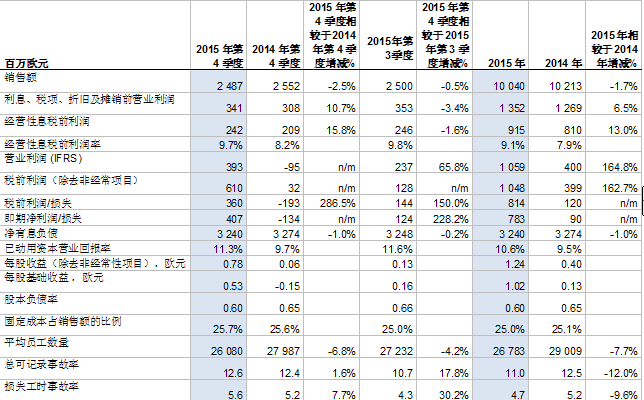 · 經(jīng)營活動產(chǎn)生的現(xiàn)金流保持強(qiáng)勁,2015年總計為15.56億歐元(2014年:11.39億歐元);投資活動產(chǎn)生的現(xiàn)金流為5.99億歐元(2014年:2.55億歐元)。