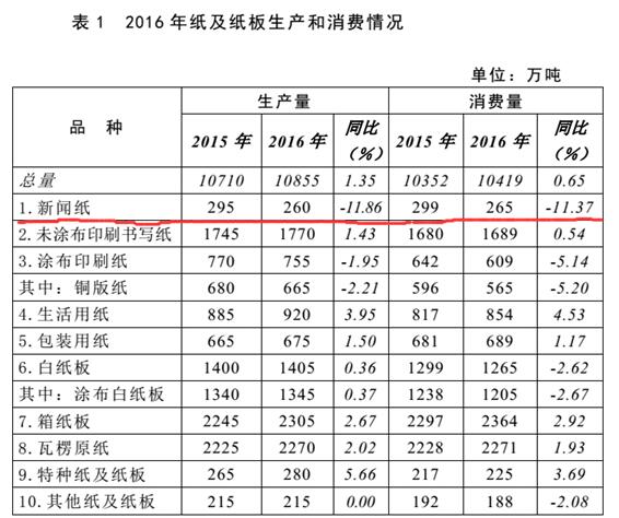 來自中國造紙協(xié)會的數(shù)據(jù)顯示,2016年在生活用紙和包裝用紙均有增長的情況下,新聞紙的產(chǎn)量和用量大幅下滑11%,而從2010年起,這已經(jīng)是新聞紙產(chǎn)量用量第七年下滑,也是從那個時候起,隨著智能手機的普及,新媒體開始蓬勃發(fā)展,并不斷蠶食傳統(tǒng)紙媒的市場份額……
