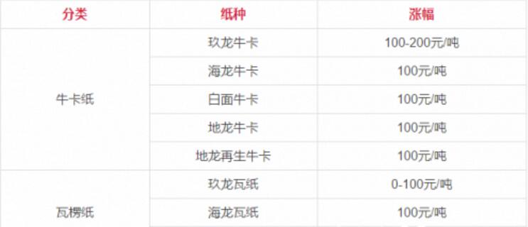 說明:調價執行時間為2017年10月11日-10月20日。 此外,也有消息顯示:10月11日-10月20日期間,玖龍天津基地玖龍牌牛卡漲200元/噸,除灰底白板紙價格不變外,其余所有紙種價格上漲100元/噸;玖龍沈陽基地所有紙種價格上漲100元/噸。 東莞玖龍9月起曾提價4次,累計提漲1000-1400元/噸不等 9月1日,東莞玖龍紙業宣布所有牛卡、瓦楞紙漲300元/噸,白板紙漲200元/噸,執行時間9月1日至9月10日。 9月10日,東莞玖龍再度上調價格,玖龍、海龍牌牛卡紙漲600元/噸,地龍、地龍再生箱板紙漲500元/噸;50、70克芯紙漲600元/噸,其他克重芯紙漲500元/噸;灰底白板紙漲300元/噸;白面牛卡紙漲500元/噸。(執行時間為9月11日至9月18日);天津玖龍低克重瓦楞紙漲600元/噸,其它箱板紙、瓦楞紙漲500元/噸。太倉玖龍瓦楞紙漲500-600元/噸。 9月18日,東莞玖龍再上調產品價格,其中,優質牛卡紙每噸再漲200元/噸,瓦楞紙/普通牛卡紙每噸再漲100-150元/噸,執行時間為9月19日至9月25日。 9月21日,東莞玖龍本月第四次調價,玖龍牛卡、海龍牛卡、白面牛卡、涂布牛卡紙漲300元/噸;地龍牛卡、地龍再生年卡漲200元/噸;玖龍瓦紙50、70克漲300元/噸,其余瓦紙漲200元/噸;白板紙漲200元/噸。執行時間為9月26日至10月10日。 后市預測:10月中下旬價格走勢預判出現分化 盡管9月全國箱板紙均價已高達6000元/噸上下,瓦楞紙均價已高達5800元/噸上下,但在節前的一次調查中,仍有多達40%的業內人士認為10月上旬價格還會飆升,最高可達7000元/噸,但也有45%的業內人士認為上漲空間有限。實際情況是60%的人預判準確。 對于10月中下旬的紙箱原紙價格走勢,目前業內人士也呈現出截然不同的預判。看漲派認為,隨著雙十一及春節旺季的來臨,以及局部地區環保監察力度的加大,紙價仍存上漲動力,保守估計上漲幅度為200-400元/噸。看跌派認為,前期節日需求提前透支,加之國外原紙的沖擊及下游價格接受度有限等因素影響,不排除10月中下旬價格企穩甚至微幅下跌的可能。