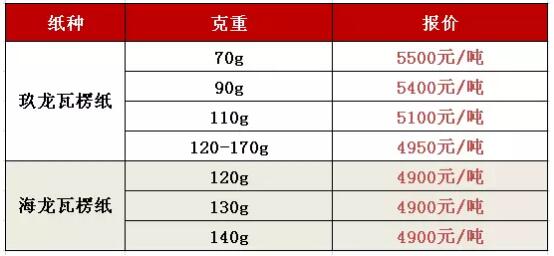 5月10日,華印小編獲悉,玖龍紙業已正式上調原紙價格,其中瓦楞紙價上調400元/噸。 而目前天津玖龍出廠含稅電匯參考價中,以下紙種的價格已經超過5000元/噸:玖龍瓦楞紙70g、90g、110g。 天津玖龍紙業5月10日紙價: