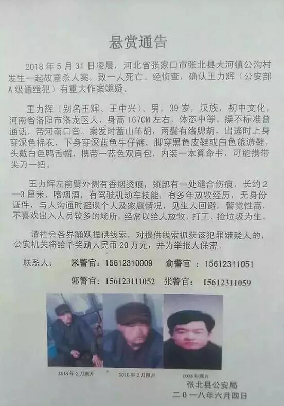 近日,北京市延慶區(qū)街頭張貼了不少公安部A級通緝令。通緝令中稱,2018年5月31日凌晨,河北省張家口市張北縣大河鄉(xiāng)公溝村發(fā)生一起致1人死亡命案,公安部A級通緝令在逃人員王力輝有重大作案嫌疑。 原來,這個網(wǎng)上的A級通緝犯是一個極度危險的人物,他曾經(jīng)是一名造紙廠工人,并在河南、河北、山西三省作案多起,殺害6人,重傷1人,逃亡12年。