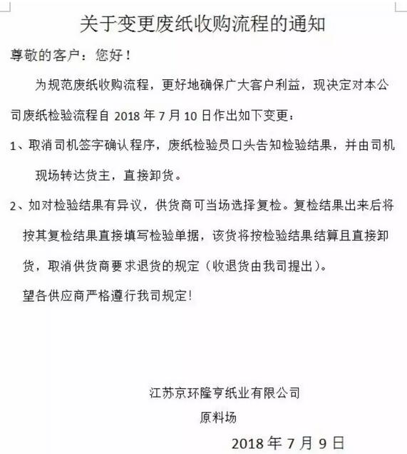 越來越嚴:陽光紙業、永豐余等6家紙廠發布廢紙收購新標準 山東昌樂世紀陽光紙業 濰坊大環國廢管理通告尊敬的供應商您好:針對目前國廢存在的一些質量問題,現將國廢來貨質量問題及公司規章制度重新強調如下,請各供應商嚴格遵守。 1、嚴格控制國廢中的加重紙類、生漿及生料類、不可用纖維類、非纖維類物質等垃圾,如超過10%則扣點50%,超過15%則扣點100%。 2、來貨中嚴禁夾帶易燃易爆品如未燃盡的煙花、爆竹等,若有夾帶一經查實罰款2000元。 3、為加強對省外廢紙原料監管力度,堵塞原料收購管理漏洞,如省內原料謊報省外原料的,一經查實罰款10000元并沒收整車原料。 4、為做好安全消防工作,請各供應商叮囑司機,必須配齊滅火器材;嚴禁穿拖鞋、背心,著裝必須整齊。為節約進場時間,盡量自己配帯滅火帽,對違反規定者嚴禁進廠。 5、各供應商根據自己的來貨質量報對來貨種類,對于亂報種類造成降級的車輛,將出廠重新排隊。 6、送貨車輛進入我司廠內后,不準私自放掉水箱內的水;如發現司機在我司廠內放水行為,每次罰款5000元。 7、嚴禁故意摻假,一年內第一次故意摻假給予貨物降級并罰款5000元;第二次故意摻假給予貨物降級并罰款10000元;第三次故意摻假給予沒收貨物,打入“黑名單”并罰款50000元;行為極其惡劣的直接予以沒收整車貨物。 8、要嚴格遵守已簽訂的反商業賄賂協議書,如發現不正當的交易行為,我公司將聯系司法機關對涉及到的人員進行調查,按協議書相關規定進行處理望廣大供應商嚴格控制來貨質量,遵守我公司的各項管理規定以上通告自2018年7月10號執行,敬請配合。 濰坊大環再生資源有限公司原料部 2018年7月9號 江蘇揚州永豐余 揚州永豐余紙廠紙芯管驗收標準: 1、允許芯管比例,紙芯管重/整車廢紙重量小于5%--允收; 2、紙芯管重/整車廢紙重量大于5%,小于8%則計扣3%; 3、紙芯管重/整車廢紙重量大于8%,紙器紙收下,紙芯管全部退貨; 4、發現夾帶(隱藏)整車退貨。 (注意:揚州永豐余紙業前兩天剛發布了一版國廢新標準,這是第二次發布的新標準,可見紙廠對廢紙質量的整治力度之大) ——自2018年7月10日起執行!特此通知 山東淄博九鹿紙業