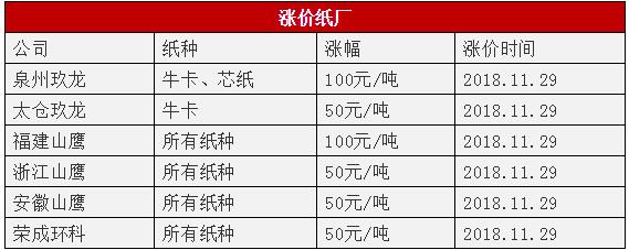 榮成跟漲50元/噸,今天起玖龍(泉州、太倉)、山鷹(安徽、浙江、福建)齊漲價 11月28日一大早,江蘇榮成環科股份有限公司(簡稱“榮成環科”)亦對外發布漲價通知。公司稱受原材料及其他綜合成本持續上漲影響,為維持貴我雙方長期友好合作,經研究決定從2018年11月29日起,公司所有原紙紙種的售價統一上調50元/噸。