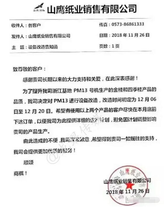 浙江山鷹紙業:PM13進行設備改造,改造時間初定為12月6日至12月20日。停機時長15天左右,影響金桂和四季桂。