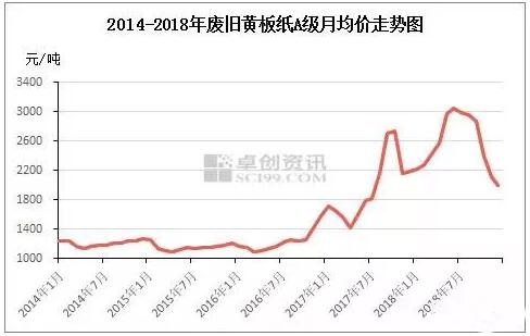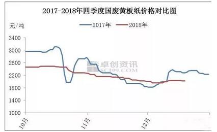 2018年四季度國廢黃板紙價格震蕩下跌,據卓創資訊數據顯示,2018年四季度國廢黃板紙均價2204元/噸,同比下降7.55%,環比下跌24.80%。2018年四季度國廢黃板紙價格震蕩下跌的邏輯如下。