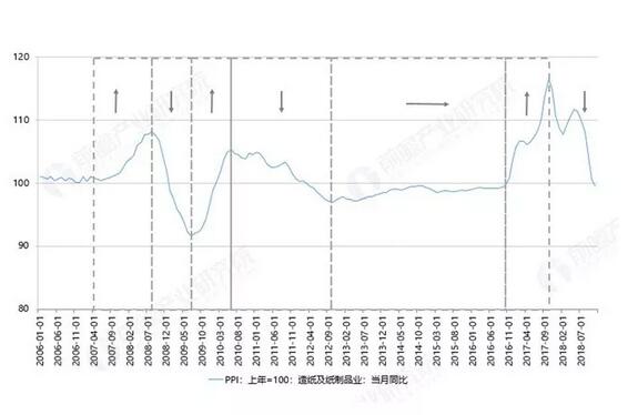 從我國造紙行業的PPI走勢來看,呈現出明顯的周期波動性。2017年造紙行業的景氣度不斷攀升,而2018年造紙及紙制品行業PPI指數總體急劇下降,截止到2018年11月30日,PPI指數更是跌破100,為99.6,跌回到2016年9月的水平。總體來看,2018年中國造紙行業的景氣度有所下滑。