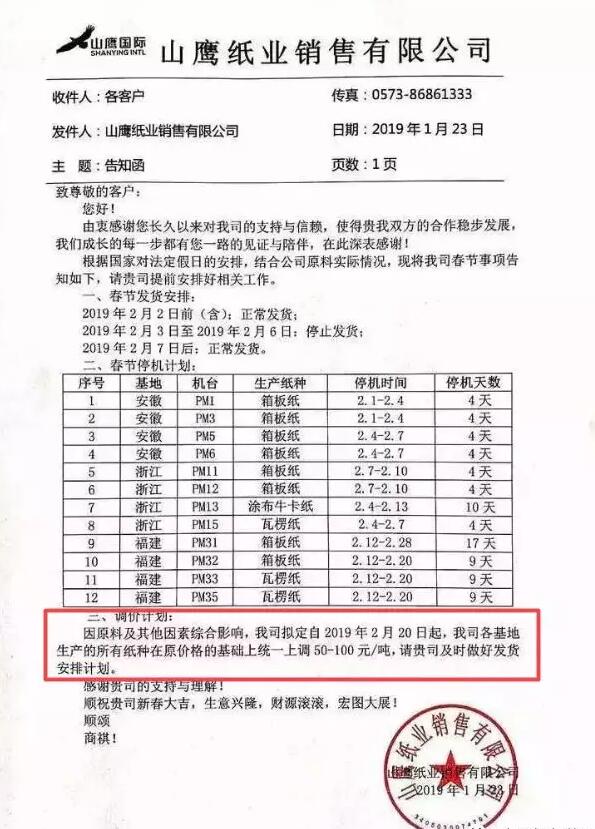 再加上年前宣布在2月20日漲價的山鷹紙業(yè),紙廠的此番舉動無疑證明了此前部分業(yè)內(nèi)人士的預(yù)測:隨著節(jié)后存補庫需求、紙廠停機時長增加等因素,包裝紙市場存在階段性探漲預(yù)期。 山鷹紙業(yè) 自2月20日起,各基地的所有紙種統(tǒng)一上調(diào)50-100元/噸。