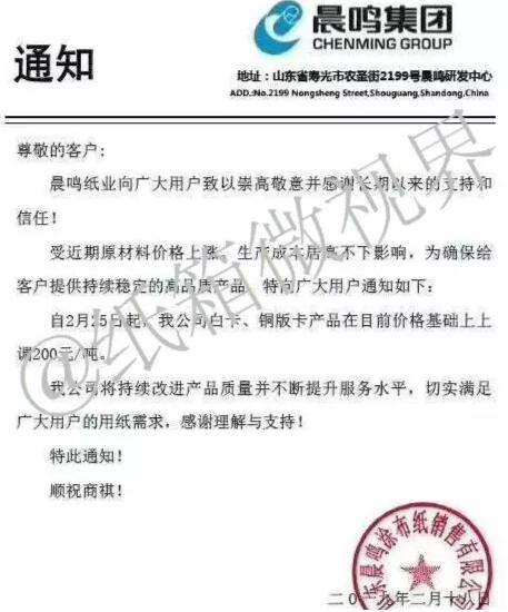 新增14張原紙漲價函, 晨鳴、APP、博匯、萬國紙業等巨頭同時宣布提價, 最高漲200元/噸 2月18日,山東晨鳴紙業發布漲價函: 2月25日起,上調白卡紙及銅版卡紙200元/噸。