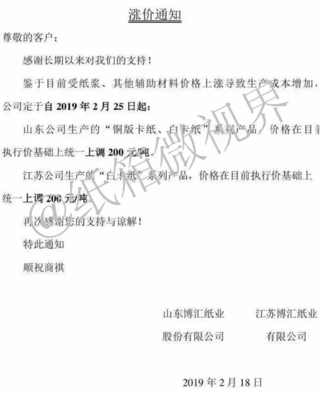 2月18日,山東博匯紙業/江蘇博匯紙業發布漲價函: 2019年2月25日起:山東公司生產的“銅版卡紙、白卡紙”系列產品,價格在目前執行價基棊礎上統一上調200元噸。江蘇公司生產的“白卡紙”系列產品,價格在目前執行價基礎上統一上調200元噸。