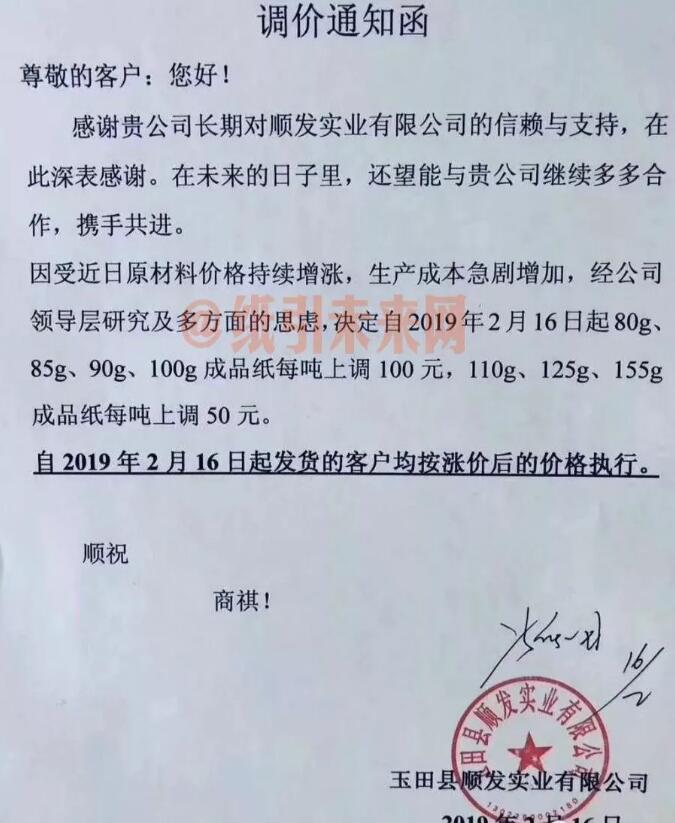 2月16日,玉田縣順發實業有限公司發布漲價函: 2019年2月16日起80g、85g、90g、100g成品紙每噸上調100元,110g、125g、155g成品紙每噸上調50元。 自2019年2月16目起發貨的客戶均按漲價后的價格執行。