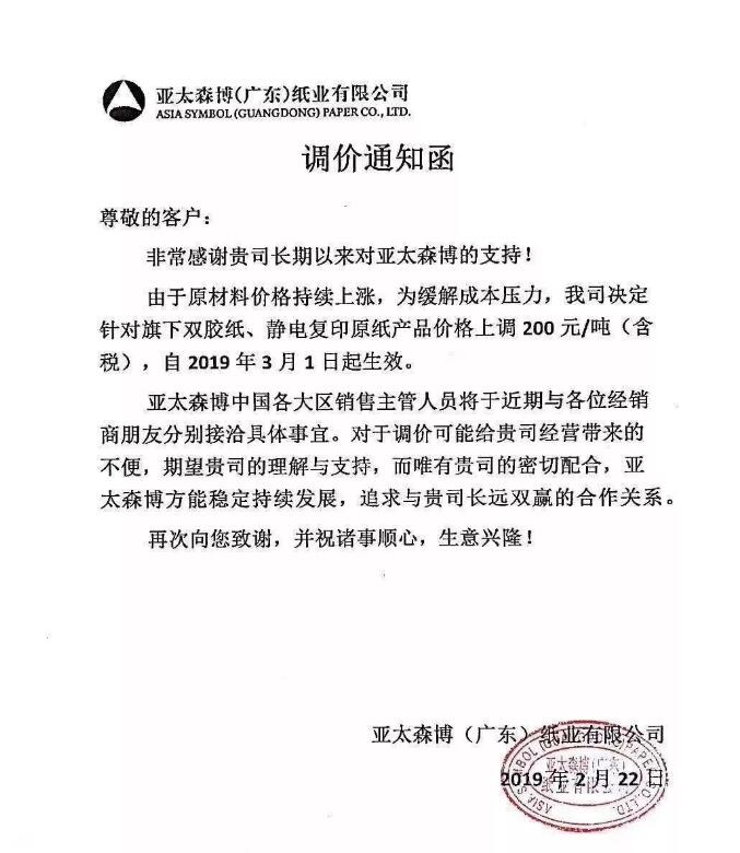 亞太森博(廣東):我司決定針對旗下雙膠紙、靜電復(fù)印原紙產(chǎn)品價格上調(diào)200元/噸(含稅),自2019年3月1日起生效。