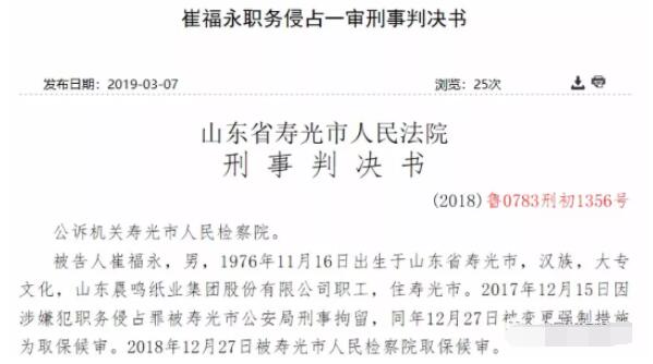 3月7日,中國裁判文書網發布了山東晨鳴紙業集團股份有限公司員工崔福永職務侵占一審的刑事判決書。判決書顯示,崔福永曾在任職期間竊取車間設備,由他人代為銷售獲利8萬元。