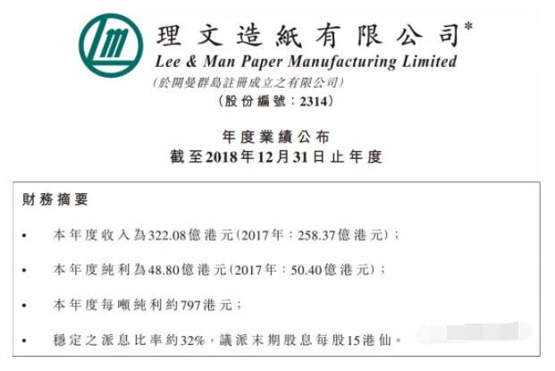 繼玖龍紙業后,國內造紙行業另一家巨頭--理文造紙也公開了其業績。3月11日,理文造紙公布2018年業績:截至2018年12月31日止,實現收入322.08億港元,同比增長24.66%;純利48.80億港元,同比減少3.17%。 其中,包裝紙業務收入為271.56億港元,同比增長約17.55%,約占總營業收入的84%;營業利潤實現收入為54.56億港元,同比下滑約9.67%,約總營業利潤86%。