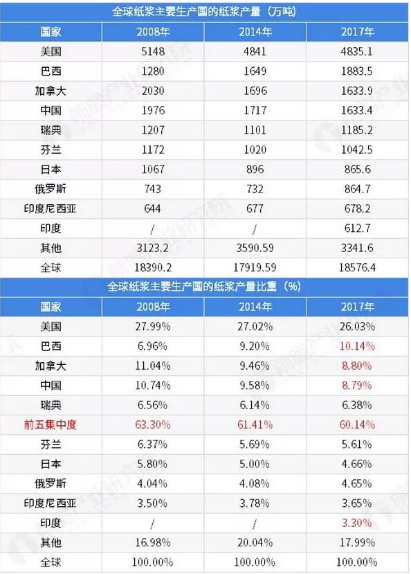 紙漿產業有望進一步向巴西遷移 通過對比全球紙漿主要生產國的紙漿(不包含廢紙漿)產量發現三個特征: 第一,2008年和2014年印度的紙漿產量沒有進入全球排名前十國別,2017年產量躍居全球排名第十; 第二,隨著發展中國家和新興經濟體的快速發展,造紙需求倒逼原料紙漿產業發展,各國相繼投入到紙漿制造行業中,地區集中度有所下降,從2008年的63.30%下降到60.14%。 第三,美國、加拿大、中國、瑞典、芬蘭、日本等市場份額均下降,巴西、俄羅斯和印度尼西亞的比重均上升,其中表現最為明顯是巴西,產量占比從6.96%上升至10.14%,在全球地位已經超過中國和加拿大,紙漿產業正在向巴西遷移。 此外,根據巴西木材協會最新公布數據,得益于紙漿國際商品價格的上漲,2018年1-11月,巴西國內紙漿產量達1930萬噸,比2017年同期增長9.6%,月均產量達到170萬噸。綜合以上分析,巴西在全球紙漿行業的地位有望進一步突破。 圖表6:歷年全球主要國家紙漿產量對比(單位:萬噸,%)