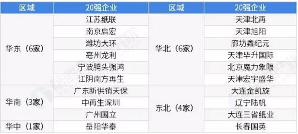 廢紙回收企業主要集中在華東和華北地區 根據中國再生資源回收利用協會評選的20強企業的數量區域布局看,中國回收紙二十強企業主要分布在華東和華北地區,其中,華東、華北地區各有6家企業入圍前二十強,且華東沿海地區的企業在銷售收入指標排名都比較靠前;另外,東北地區4家,華南地區3家,華中地區1家。其中,部分企業是直接加工為廢紙漿自用,如大連三省紙業、岳陽華泰等;考慮到節省廢紙運輸成本,廢紙加工企業一般與廢紙回收企業的廠房地區分布情況類似。 圖表14:中國廢紙回收20強及其地區分布情況(單位:%)