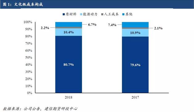 根據五家2018年報發布的數據計算,文化紙成本構成中原材料端約占80.7%。