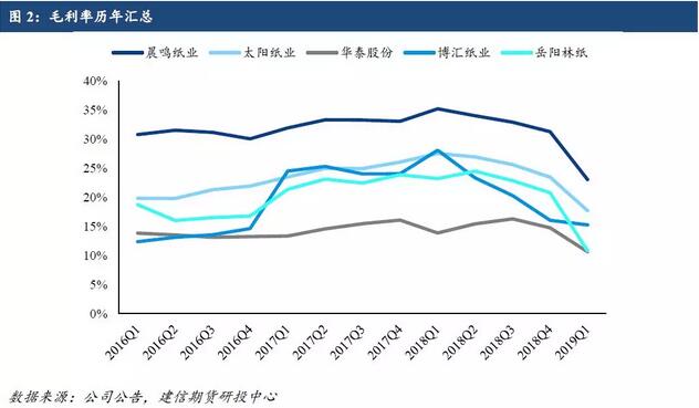 2018年及2019年一季度毛利率均同比下滑,也側面印證了去年以來造紙原材料成本端面臨壓力,下游需求表現較差。