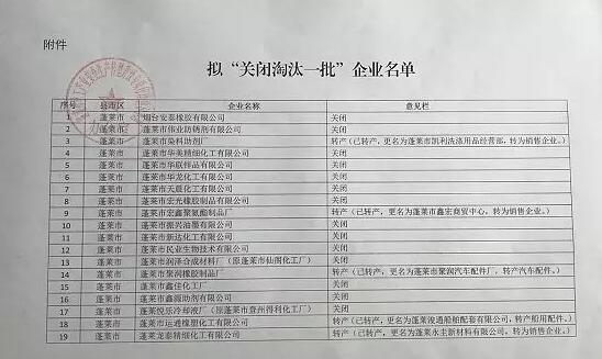 蓬萊擬“關閉淘汰一批”(第一批)化工生產企業名單