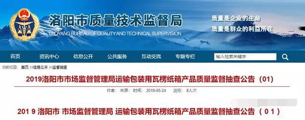 近日,洛陽市市場監督管理局發布抽查公告稱,洛陽市質量技術監督檢驗測試中心于2019年第1季度,對全市范圍內運輸包裝用瓦楞紙箱生產企業進行市監督檢查。
