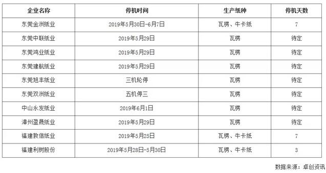 紙廠5月底、6月初相繼停機檢修,目的是什么? 本輪調降之前,華南地區紙廠均對紙市后期走勢存悲觀預期,其中廣東部分中小型紙廠已在龍頭紙企調降之前調整5-7次,累計降價200-300元/噸。而龍頭紙企的這次大幅度調價成為壓垮紙廠開機信心的最后一根稻草。調價當日華南地區部分紙企相繼發布停機檢修通知。 表1 華南地區部分紙企停機檢修匯總表