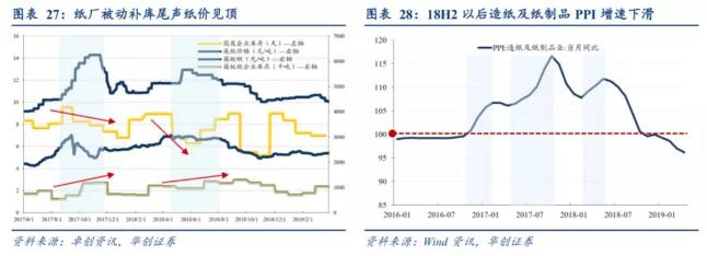 2、行業(yè)現(xiàn)狀:終端需求不振拖累上游,庫存去化開啟為提價蓄勢 下游終端需求不振,供需差呈增加趨勢。廢紙系成品紙多用于通信IT及電子、家電、辦公設備、日用化工、食品飲料、醫(yī)藥等行業(yè)。其中,以食品飲料、日化用品的包裝需求為主,需求占比在60%以上,家電、電子行業(yè)的包裝需求占比約為30%,快遞類包裝需求占比10%。根據(jù)國家統(tǒng)計局數(shù)據(jù)顯示,2019年4月社會零售總額30586億元,當月同比增速為7.2%,如考慮4月份節(jié)假日天數(shù)同比減少兩天因素,測算得4月當月社會消費品零售總額同比增長8.7%,與上月基本持平,處于近年來低位,社零增速整體下行反映終端消費需求不振,反饋至上游紙企挺價乏力。