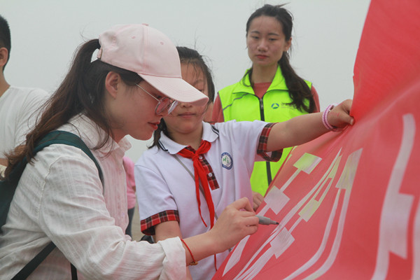 參加“環保你我他”活動的志愿者和同學們在向游客講解環保知識,倡導低碳生活方式,并邀請游客在橫幅上簽名,加入到藍天保衛戰中來。