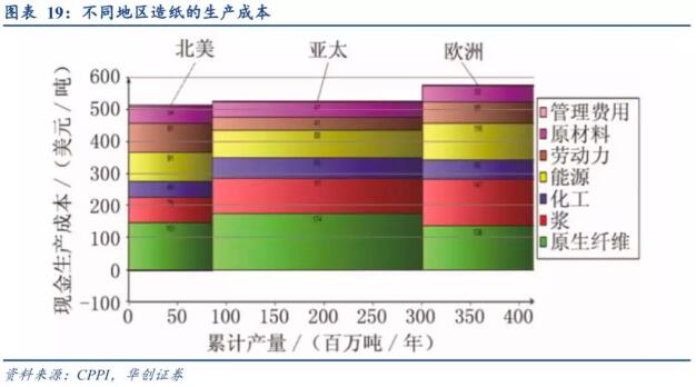 低廉的纖維成本是主因:對比北美和亞太地區的產紙生產成本,從成本總量來看,北美平均較亞太地區低10美元/噸,差距微小;從成本結構(原料/化工輔料/能源/折舊)來看,北美/亞太/歐洲地區原料生產成本分別為230/285/284美元/噸,占各自生產成本的45%/54%/49%,由于纖維原材是造紙的主要成本構成部分,國外高效的運營效率疊加低廉高質的原廢材料為美企天然提供了強大的成本優勢。 亞太區人工成本比較優勢逐漸弱化:亞太地區依賴低廉勞動力的比較優勢,北美/亞太/歐洲地區人工成本分別為91/41/66美元/噸,占各自生產成本的18%/8%/11%,成品紙總產量年達2.8億噸/年;隨著我國人工成本的攀升,比較優勢難以永續,盡管龍頭在緬甸、老撾、越南布局繼續尋求勞動力紅利,但原料優勢、經營效率才是破局的根本之道。