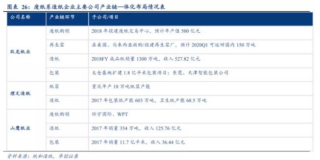 緩解供需雙邊擠壓困境,產業鏈一體化趨勢突顯。從產業鏈的角度來看,造紙行業屬于中游制造行業,其上游是紙漿、廢紙等原料,下游是包裝行業,而造紙企業能否獲得可觀收益與原材料供給是否充足和下游需求是否旺盛密切相關。一方面,18年以來造紙原材料供應緊張,造紙成本大幅攀升;另一方面,下游包裝環節需求不振,行業庫存不斷攀升。供需雙邊壓力最終導致企業業績下滑。造紙企業紛紛通過向上下游的延伸,向產業鏈一體化方向發展,以實現從源頭控制原材料降低成本,開拓包裝業務平滑下游需求波動影響。從廢紙系龍頭的布局情況來看,玖龍紙業和山鷹紙業全產業鏈布局相對完善,均觸及上游廢紙購銷環節,同時在下游部署包裝業務,實現營收的有效補充。
