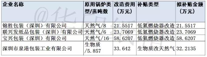 導語:根據《深圳市大氣環境質量提升補貼辦法(2018-2020年)》,現將2019年第一、二批大氣環境質量提升專項資金擬補貼項目予以公示。統計發現,有4家包裝廠將獲得鍋爐類的補貼。