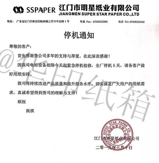 7月10日,廣東江門明星紙業發出了停機檢修通知,宣布因電站設備故障即日起緊急停機檢修5天。