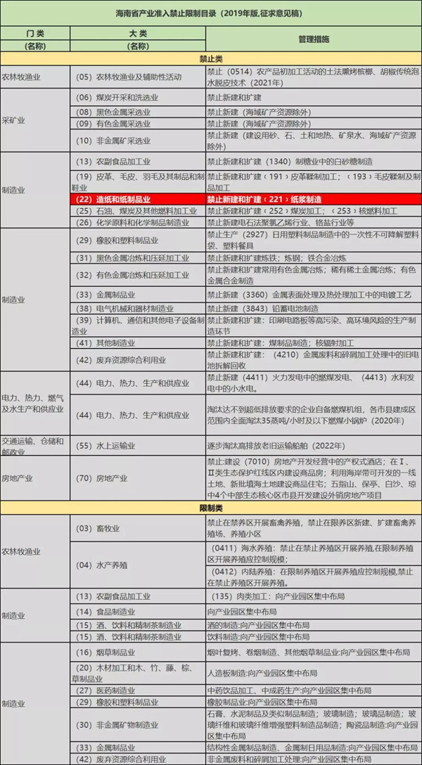 近日,海南省發(fā)布《海南省產(chǎn)業(yè)準(zhǔn)入禁止限制目錄2019年版》,目錄中,造紙業(yè)被列入禁止類列表。 海南省發(fā)布最新產(chǎn)業(yè)禁止限制目錄,造紙成禁止類行業(yè) 海南省發(fā)展和改革委員會(huì)近日建立產(chǎn)業(yè)準(zhǔn)入負(fù)面清單制度,全面禁止高能耗、高污染、高排放產(chǎn)業(yè)和低端制造業(yè)發(fā)展,海南省發(fā)展改革委、省農(nóng)業(yè)農(nóng)村廳、省生態(tài)環(huán)境廳、省水務(wù)廳、省交通運(yùn)輸廳、省住房城鄉(xiāng)建設(shè)廳等部門(mén)聯(lián)合編制了《海南省產(chǎn)業(yè)準(zhǔn)入禁止限制目錄2019年版》(以下簡(jiǎn)稱《目錄》),于7月29日至8月2日面向社會(huì)各方征求意見(jiàn),社會(huì)各方可通過(guò)信件或電子郵件等方式提出。 據(jù)悉,《目錄》自發(fā)布之日起生效,每年修訂一次,按照《國(guó)民經(jīng)濟(jì)行業(yè)分類》分為禁止類和限制類兩類。其中,禁止類是指不允許新增固定資產(chǎn)投資項(xiàng)目,列明時(shí)間的現(xiàn)有產(chǎn)能要按期限退出;禁止類包括6大門(mén)類、21個(gè)大類、22條管理措施。限制類主要包括區(qū)域限制、規(guī)模限制和產(chǎn)業(yè)環(huán)節(jié)、工藝及產(chǎn)品限制,包括兩大門(mén)類、12個(gè)大類、13條管理措施。