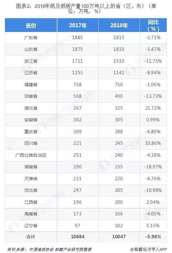 而在省份格局上,廣東、山東以及浙江為主要產(chǎn)區(qū)。2018年廣東、山東、浙江、江蘇、福建、河南、湖北、安徽、重慶、四川、廣西、湖南、天津、河北、江西、海南和遼寧17個(gè)省(區(qū)、市)紙及紙板產(chǎn)量超過100萬噸,產(chǎn)量合計(jì)10047萬噸,占全國紙及紙板總產(chǎn)量的96.28%。